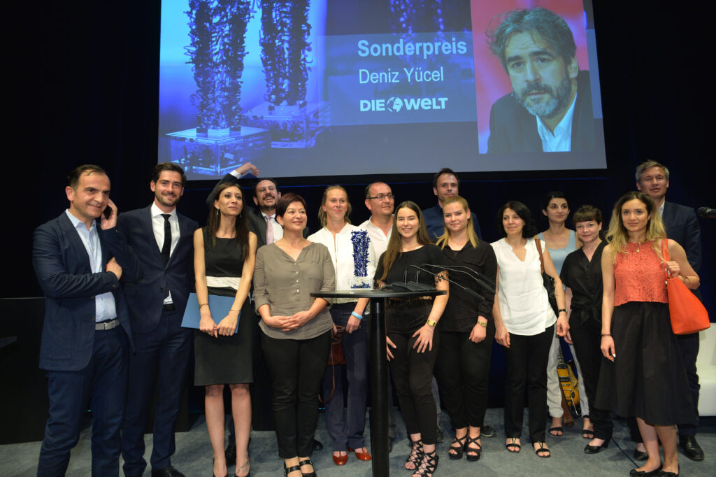 Der erstmals vergebene Sonderpreis ging an Deniz Yücel. Der Türkei-Korrespondent der Welt sitzt seit 130 Tagen in Haft. Seine Frau Dilek Mayatürk Yücel nahm mit Familie, Freunden und Kollegen die Würdigung entgegen.